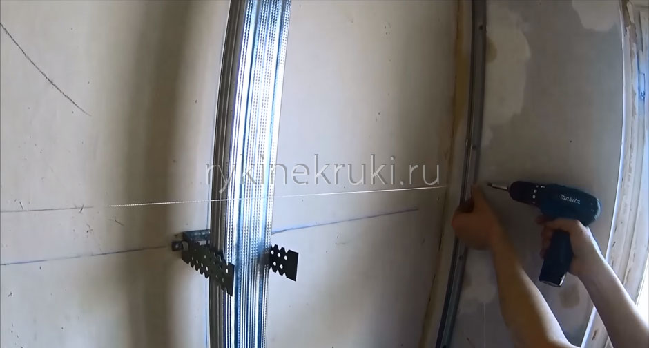 После того как стоечные профили установлены, натянем капроновую нитку и выставим их по плоскости. Для этого берем монтажку (саморез с пресс шайбой, 4.2×13 мм без сверла), приставляем к профилю и вкручиваем в профиль не до конца: