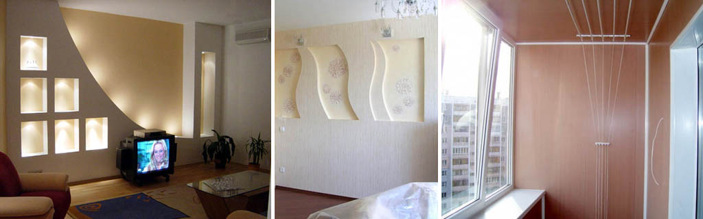 То, что из ГКЛ делают объемные декоративные детали интерьера (слева на рис.): арки, ниши, полки, подвесные потолки, даже шкафы, общеизвестно. Однако возможна и плоская многоуровневая декоративная отделка гипсокартоном, в центре на рис. Для этого заготовки клеят на стену, нанося на них тонкий (ок. 2 мм) слой клея для гипсокартона зубчатым шпателем. Если же обшивается помещение тесное, где стыков плит на стенах не будет, напр. балкон, то обшивку можно просто покрасить, а на углы наклеить ПВХ-плинтусы или уголки, справа на рис. Вариант для обшивки со стыками – не снимать фаски с кромок, зазоры между плитами оставить 2-3 мм, и закатать в них гладким валиком Т-образную мебельную ПВХ-кромку.