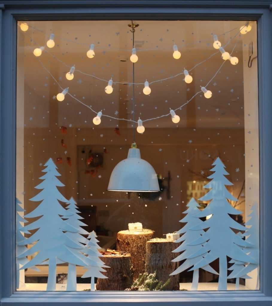С помощью прочной бумаги или картона можно создать реалистичную композицию по всей ширине окна: вырежьте елочки, домики, тучки, среди которых едут сани с оленями – расставьте в несколько слоев по всему подоконнику и разделите гирляндами, которые вечером создадут мерцающий свет.