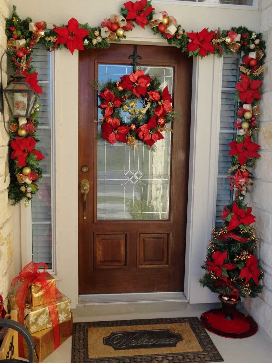 Фонарики, имбирное печенье, светодиодные висюльки, развешенные на раме, приведут прохожих в восторг. На двери по традиции должен красоваться венок. Изготавливают его из подручного сырья: