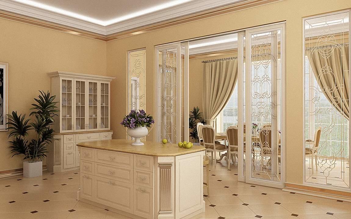 При совмещении кухни с гостиной часто нужен снос перегородок и стен, что освобождает дополнительную площадь для размещения всех необходимых предметов. При оформлении такого пространства рекомендуется размещать всю мебель вдоль стен, оставляя центр свободным для передвижения.