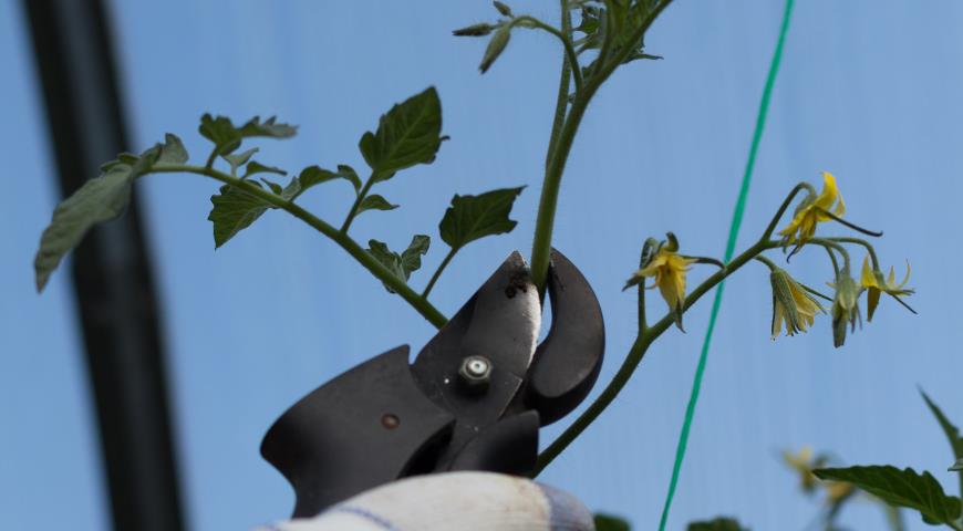 - От самой верхней кисти плодов на стебле отступают 2 листочка и лишнее отсекают. Чтобы процедура была безболезненной, используют острые маникюрные ножницы. Можно заменить их секатором, но он должен быть заточен.