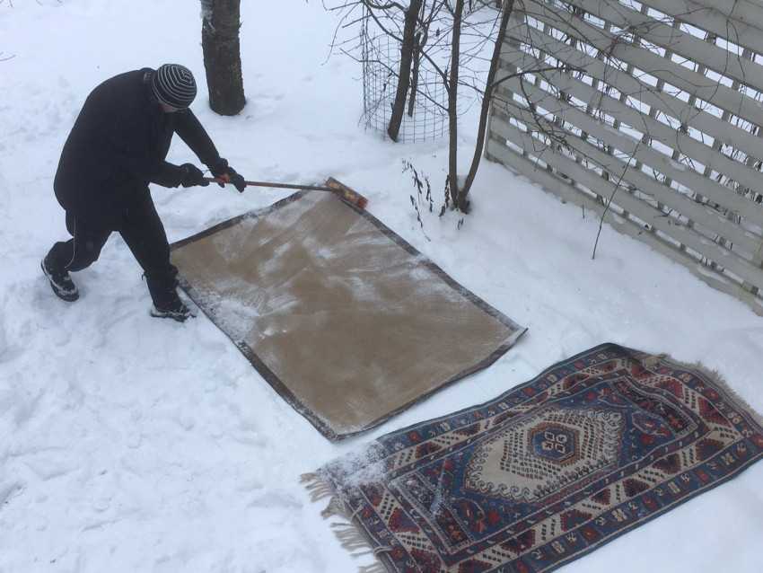 Метод актуален для снежной зимы. Он подходит для тех, кто не знает, как почистить ковёр без пылесоса с помощью подручных средств. Делаем это следующим образом: