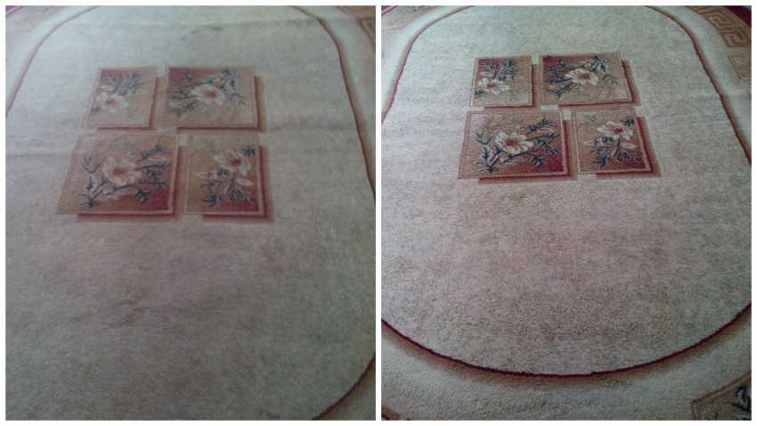 - Чтобы не испортить ковер, его нужно сначала пропылесосить в менее заметном месте. Если не остается разводов, то процедуру можно продолжать дальше.