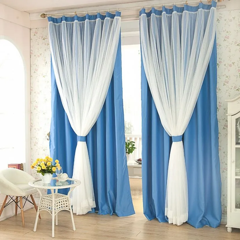 Многоцветные конструкции обычно делают из прозрачных тканей. Для такого приема нужно приобрести многоярусный карниз. Оттенки штор должны сочетаться между собой. Например, удачным сочетанием считается комбинация белых и синих занавесок.