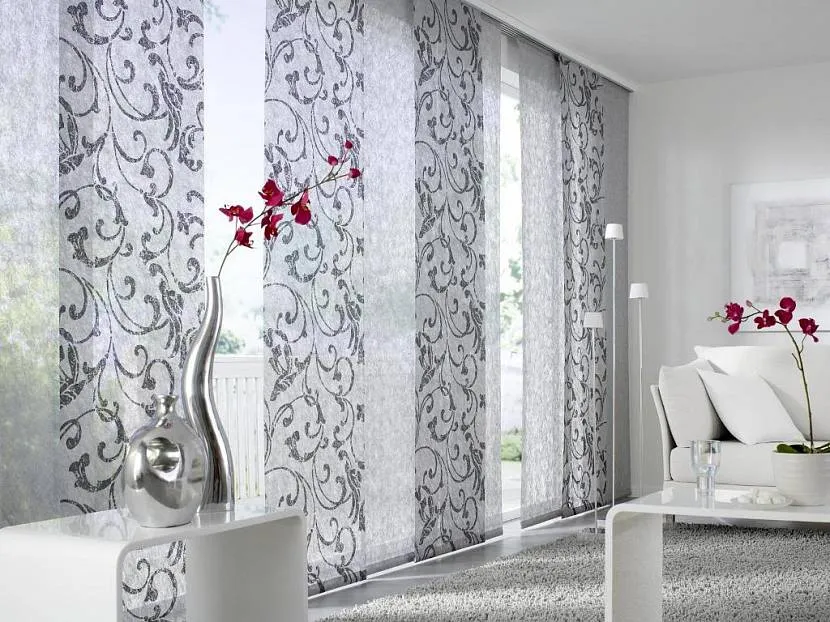 - Шторы, на которых изображен поперечный контрастный принт, зрительно расширяют комнату, а вертикальный рисунок делает ее более вытянутой.