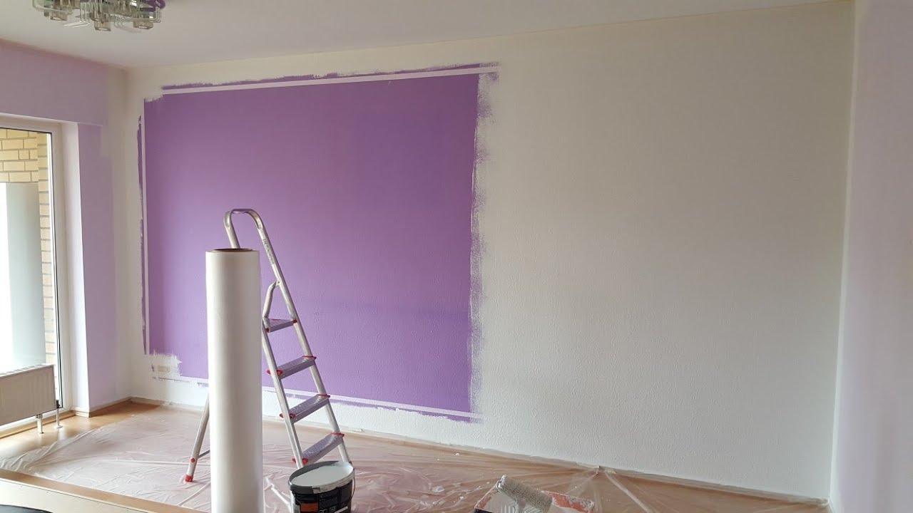 Стены, как правило, окрашиваются в два цвета — карниз в белый, а сама стена в цвет другого оттенка. В кухне, прихожей или ванной комнате стена делится на две части. Нижняя часть (примерно до 1,6 м от уровня пола) окрашивается эмалью, а верхняя — водно-дисперсионной или клеевой краской.