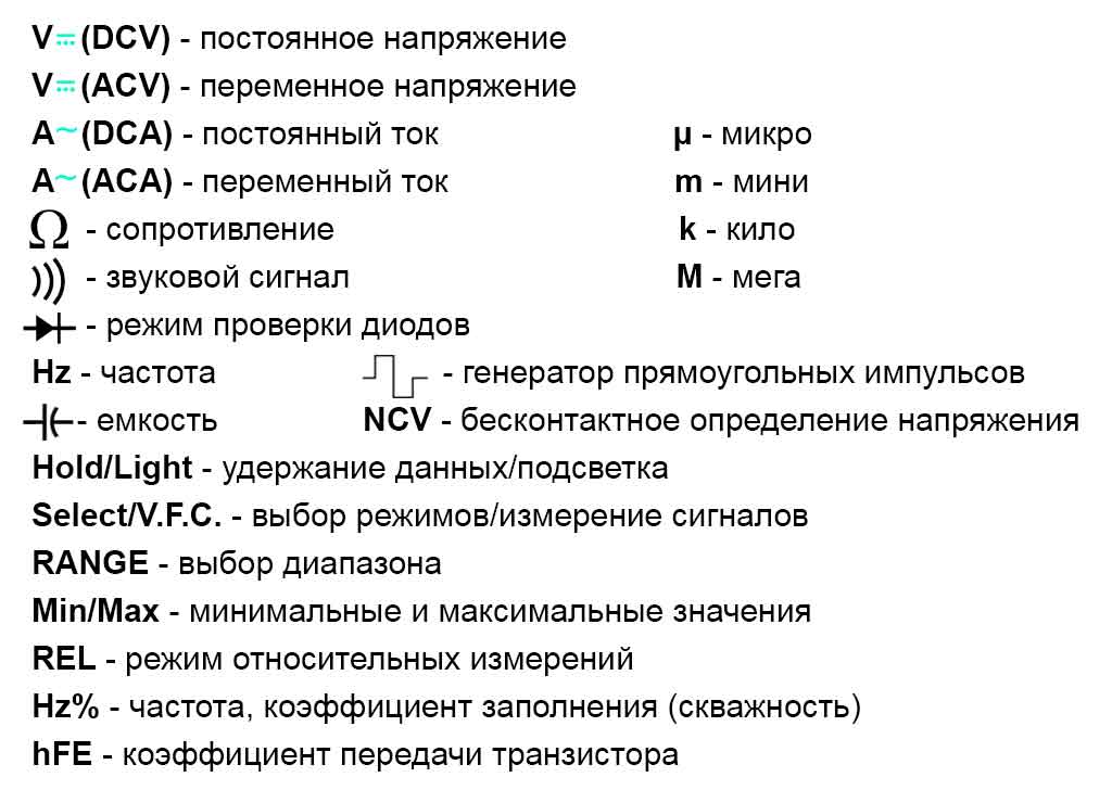 Расшифровка обозначений шкалы мультиметра по секторам: