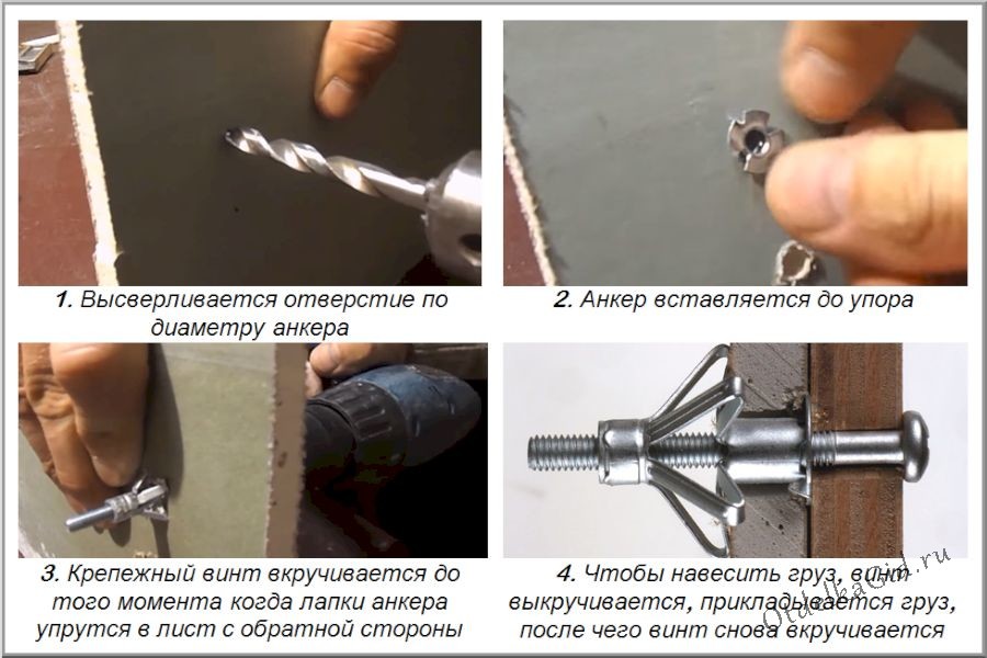 На винт надевается шайба, навешиваемый предмет прикручивается к стене. Фиксация достигается за счет того, что с несколько лапок обратной стороны раскрываются и упираются в гипсокартон.