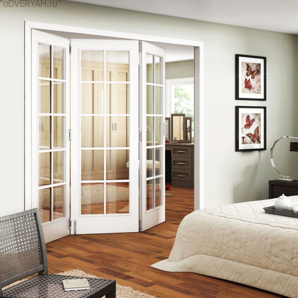 Еще есть так называемые складные двери (типа «книжка» или «гармошка»). Они также позволяют экономить пространство, но несут на себе больше декоративную, нежели функциональную нагрузку, так как похвастаться основными качествами, которыми должна быть наделена хорошая дверь (звуко- и теплоизоляцией), не могут.
