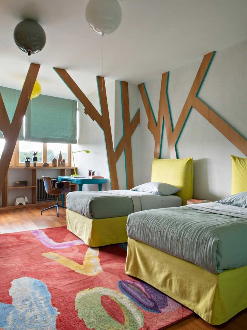 В этом случае достаточно использовать прием зонирования цветом. Также добавляются прикроватные светильники и мягкие коврики в детской зоне.