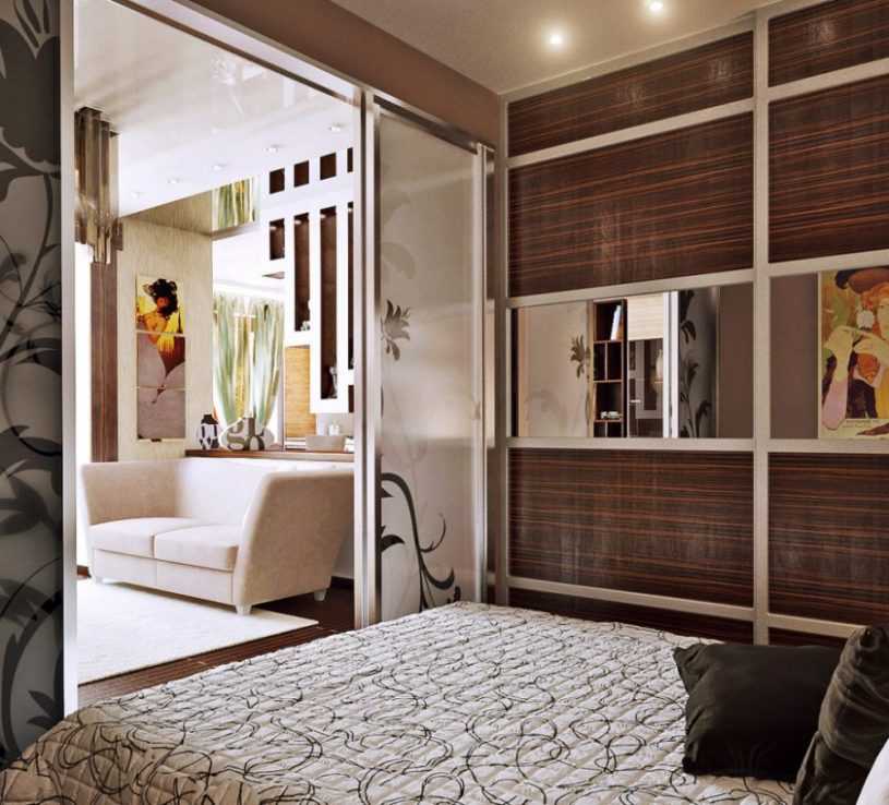 В комнате хорошо разместить, шкаф с зеркальными дверцами, или с глянцевой поверхностью, это визуально увеличит размеры пространства. Сегодня дизайнеры предлагают устанавливать в спальне-гостиной шкафы со специальной съемной панелью для работы на компьютере. Можно создать интерьер не проводя зонирование.