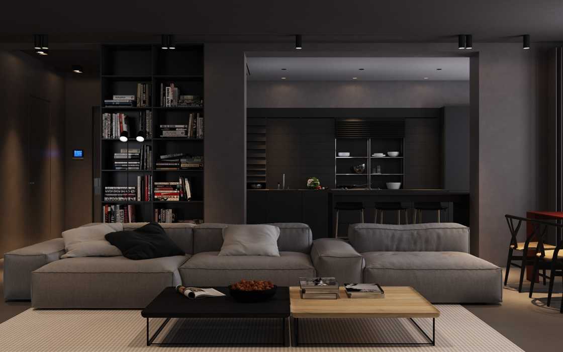 В данном случае возведена небольшая зонирующая конструкция возле стены с окнами. Она подчёркивает условную линию разграничения между кухней и гостиной. Дизайнер применил также потолочное зонирование: в потолок встроена линейная подсветка, явно указывающая на границу.
