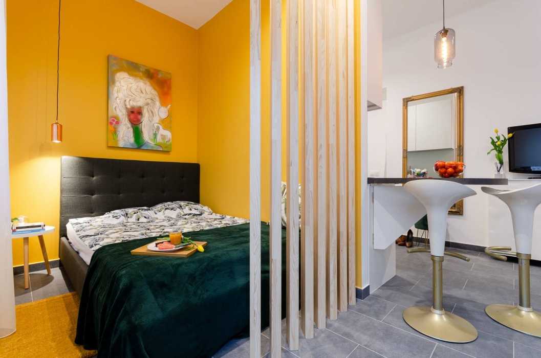 В одной комнате совмещены гостиная и спальня, чтобы подчеркнуть разное назначение частей пространства, она поделена на две равные часть вспомогательной перегородкой. При этом сохраняется общность пространства. Отделка возведённой стены в классическом стиле дополняет декоративную атмосферу интерьера.