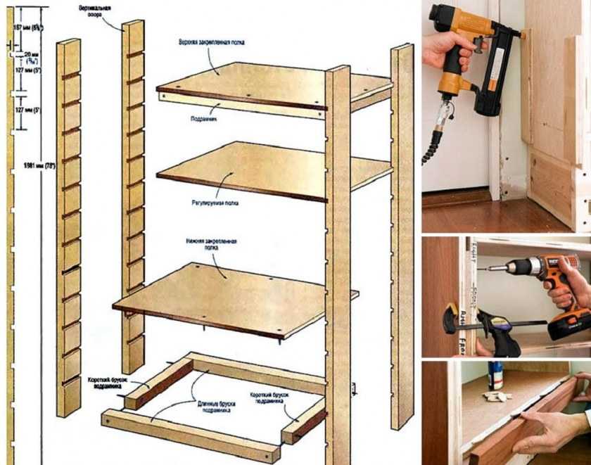Нарезаем полки необходимого размера. Детали крепятся по отношению друг к другу под углом 90 градусов. При сборке лучше пользоваться угольником. Для стабильности основы полки скручиваются друг с другом и прикручиваются к задней стенке.