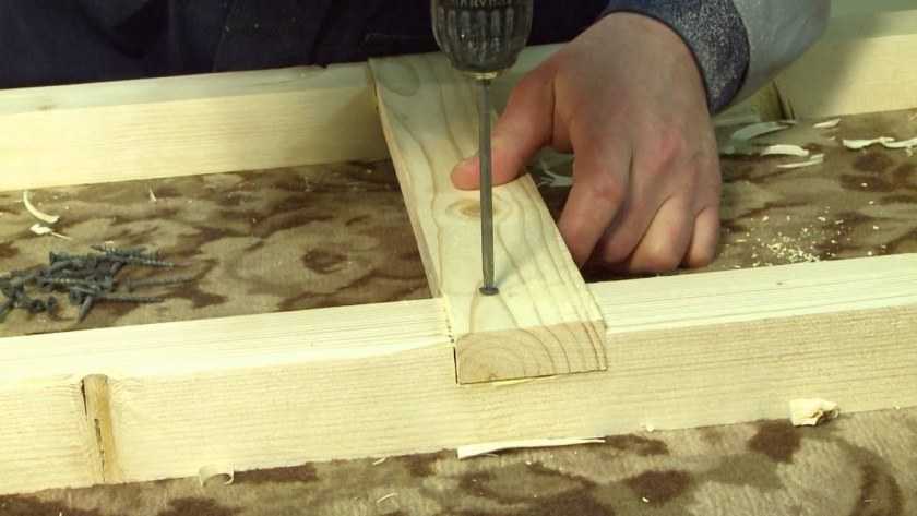 Собираем полки. Для увеличения грузоподъёмности полочек, выполняем деталь на раме из бруса с поперечным ребром жёсткости. Рейки или доски крепим поверх рамы. Соединяем полки с каркасом на саморезы. Детали предварительно шлифуются.