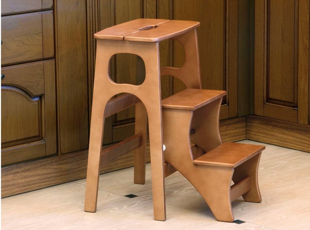 Табурет-стремянка чаще всего изготовлен из дерева. Выглядит конструкция как традиционный стул, но при необходимости преображается в удобную лесенку, которая позволяет доставать вещи с высоких полок, менять сгоревшие лампочки или выполнять мелкие ремонтные работы. Предмет мебели состоит из передней и задней боковин, сиденья, спинки, ступенек. Основные особенности изделия: