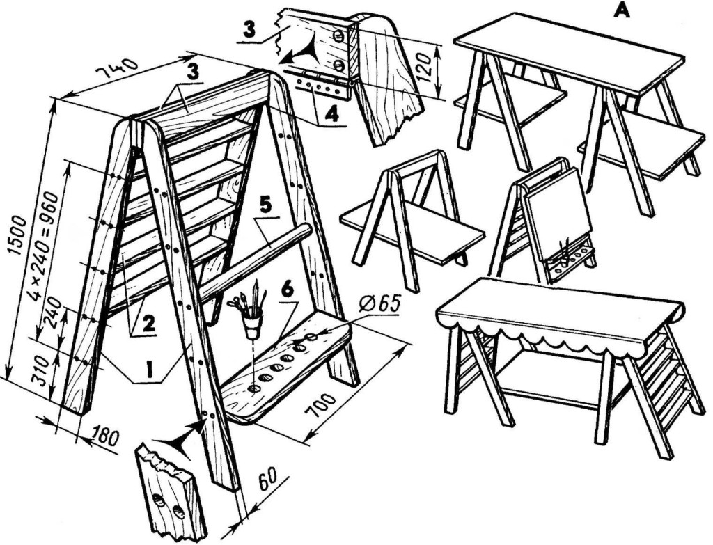 Бывает, что стремянка, будучи безусловно полезным приспособлением, большую часть своей «жизни» простаивает. Но своими руками можно соорудить стремянку, сфера применения которой будет намного шире, чем обычно. Стол, мольберт, беседка и кровать — вот, что может быть сделано с помощью конструкции, описываемой ниже.