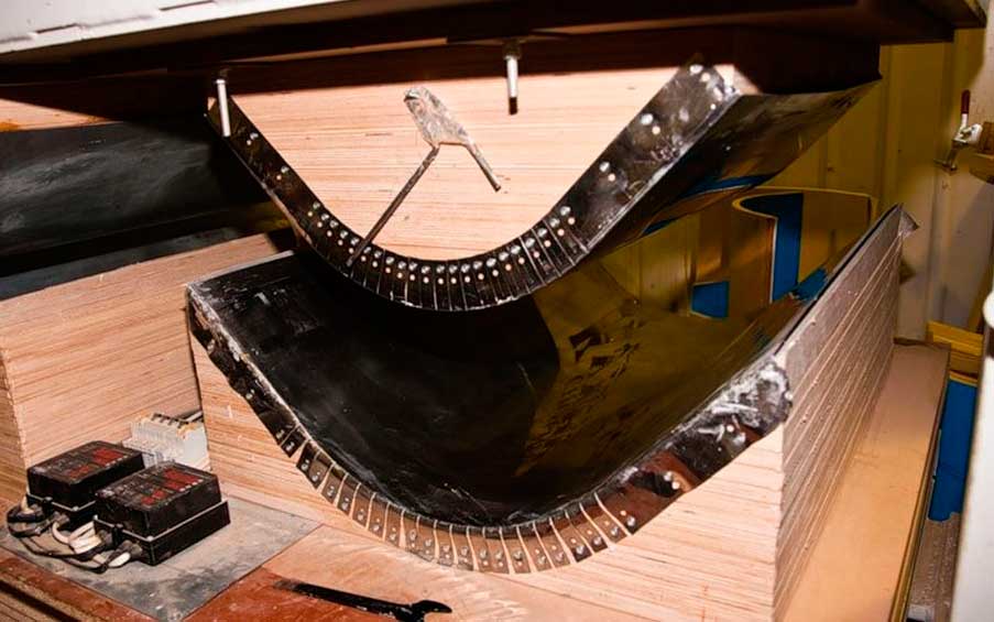 При изготовлении детали большого размера или нестандартной формы в качестве шаблона лучше использовать стальной лист. При этом выгибание фанеры нужно производить одновременно с заготовкой, прочно скрепив листы между собой. Отделить шаблон можно будет только после того, как конструкция хорошо высохнет.