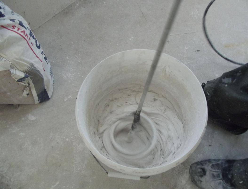 Для получения однородной, эластичной смеси следует замешивать сухую смесь с водой миксерной насадкой с помощью дрели, отмерив необходимое, указанное на упаковке количество воды и постепенно доливая воду в смесь. Не стоит сразу разводить большое количество шпатлевки, чтобы она не высыхала в процессе работы.