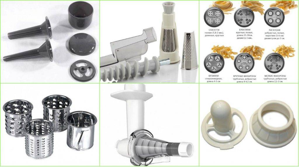 В комплектацию некоторых моделей входят специальные насадки, которые позволяют выполнять другие манипуляции с продуктами. Например: