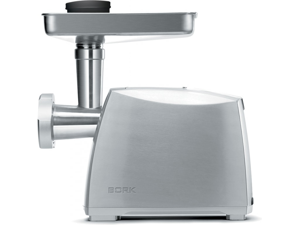 Мощная модель от немецкого бренда поставляется в прочном пластиковом корпусе. Предусмотрена ручка для переноски, есть отсеки для хранения шнура и трех дополнительных решеток. Электромясорубка поддерживает реверс, соединительные элементы у нее металлические, что делает модель особенно надежной.