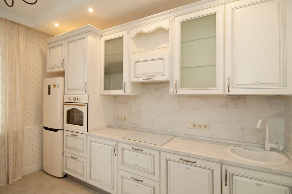 Для белого гарнитура надо выбрать белые обои с графическим рисунком, полосками или фотообои.