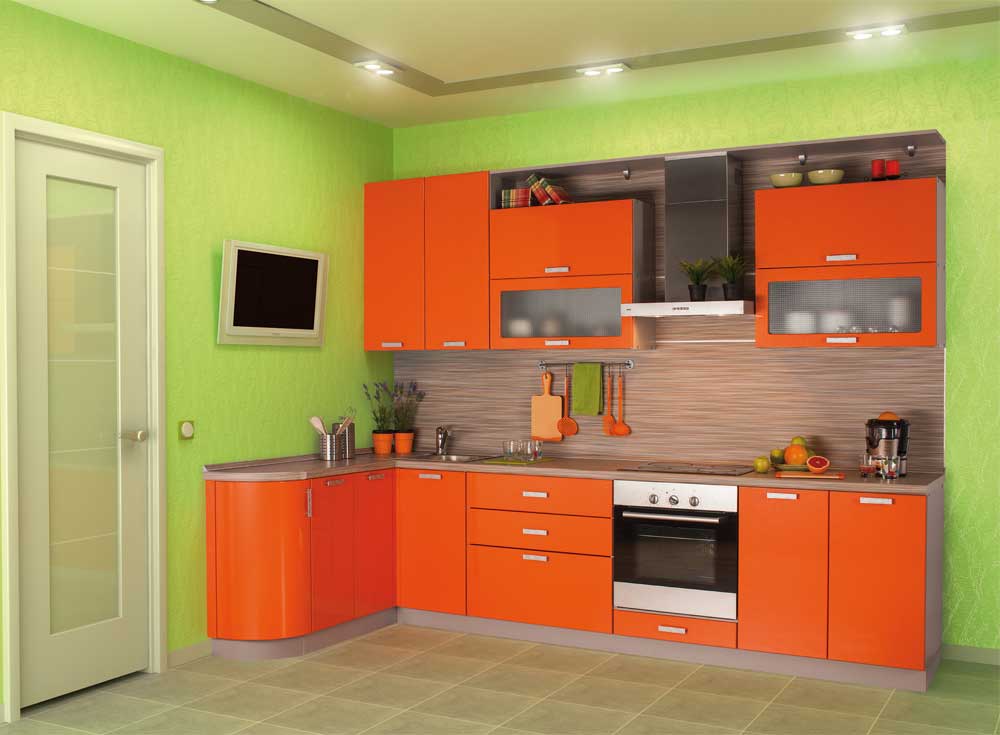 - Для кухни оптимальна комбинация ярких оттенков с приглушёнными. Например, если шкафчики красного цвета, то стены желательно сделать однотонными, неброскими.
