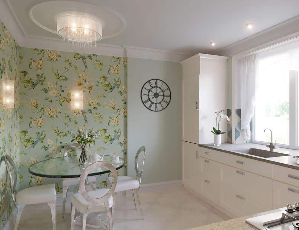 Попробуйте обустроить пространство, а именно фасады шкафов гарнитура, мятными узорами. Используйте все тот же белоснежно-белый фон. Узоры могут быть как в виде цветов, вьющихся растений, так и в виде необыкновенных, замысловатых фигур непонятного происхождения. Прекрасную компанию таком дизайну сможет составить синий цветочный букет в белой вазе, грациозно стоящи на обеденном столе.