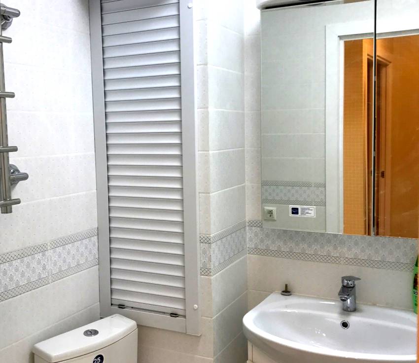 Если площадь вашей квартиры небольшая, соответственно, санузел нельзя назвать просторным, то идеальным вариантом заделки труб является монтаж рольставни или жалюзи