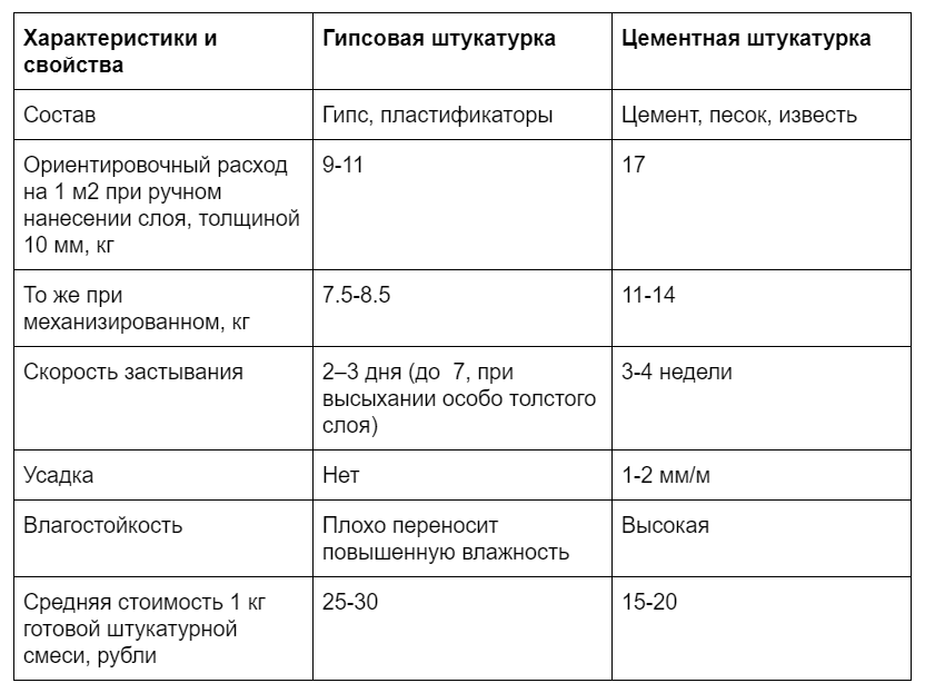 Чем отличается гипсовая штукатурка от цементной штукатурки, наверное, стало понятно из области применения и состава растворов — это разные материалы. Чтобы определить, какая смесь нужна для использования в том или ином помещении, проведем сравнительный анализ: