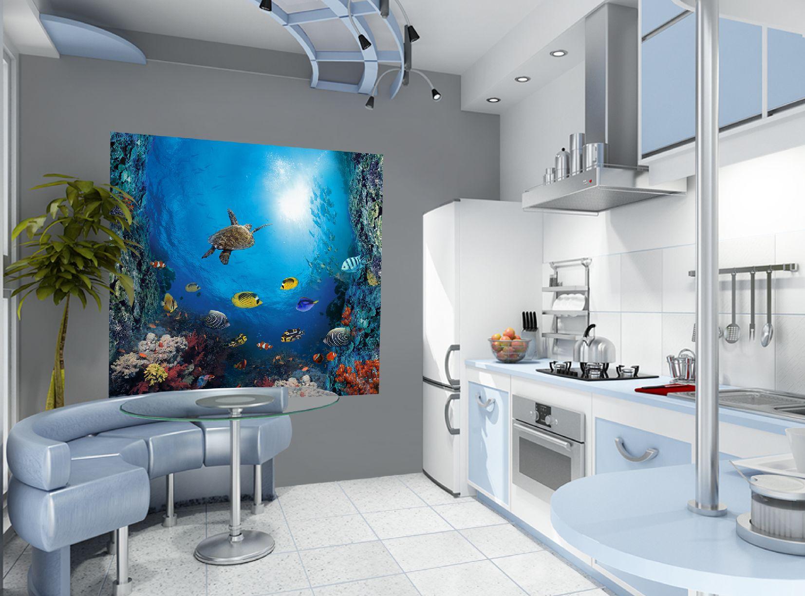 ЗD обои с изображением воды очень освежают дизайн кухни