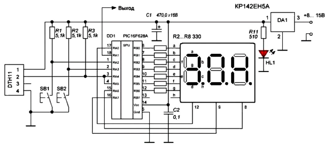 Если не рассматривать популярные готовые решения на Ардуино, можно собрать электронный детектор влажности воздуха на базе микросхемы PIC16F628A. Сенсор влажности, совместимый с такой логикой – DTH-11. Остальная элементная база – несколько согласующих резисторов и цифровое табло.