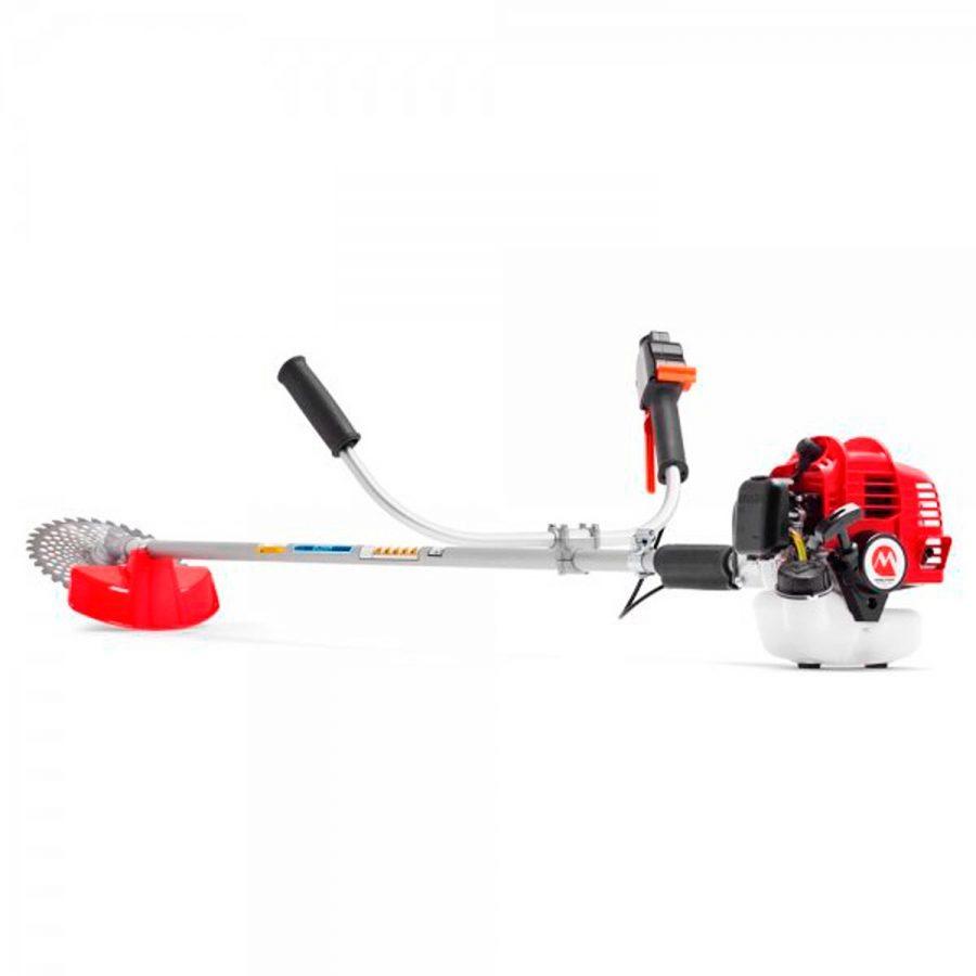 Данная мотокоса, больше подойдет настоящим мужчинам. Это обусловлено прежде всего весом 7,7 кг. Но здесь и кроется приличная мощность 1,25 кВ или 1,7 л/с. Штанга неразборная, прямая. Велосипедная рукоять, обеспечивает хороший хват и удобство в управлении. Объем топливного бака 1,2 литра, позволит без дозаправки, скашивать до 10 соток травы, сорняков и кустарников. Ширина скашивания леской 400 мм, ножом 255 мм. Максимальные обороты двигателя 9000 об/мин, на холостом ходу 2800 об/мин. В комплект поставки входит ремень наплечный, нож, кольца для поршня и прокладки между элементами двигателя и карбюратором.