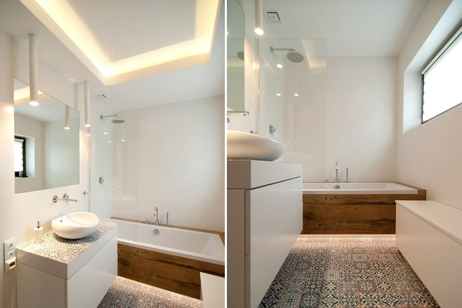 Темный плиточный пол создает точку отсчета для глаз, а контрастные светлые цвета плитки вокруг придают комнате более воздушный вид, это обман зрения, но он работает.