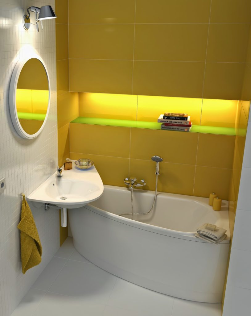 Максимально светлые тона – привносят ощущения просторности и свободы. Яркие оттенки – красочности и разнообразия. Если комната маленькая, не нужно привязываться к однотонности. Конечно, скандинавский стиль интерьера ванной может потребовать придерживаться исключительно белого цвета, а хай-тек стального серого. Но их всегда можно разбавить мелкими деталями других оттенков – черной полосой, окантовкой панели, карнизом или вертикальными полосами (на случай наличия низких потолков).