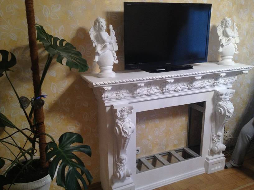 - Сверху приклеивают каминную полку, декоративный плинтус.
