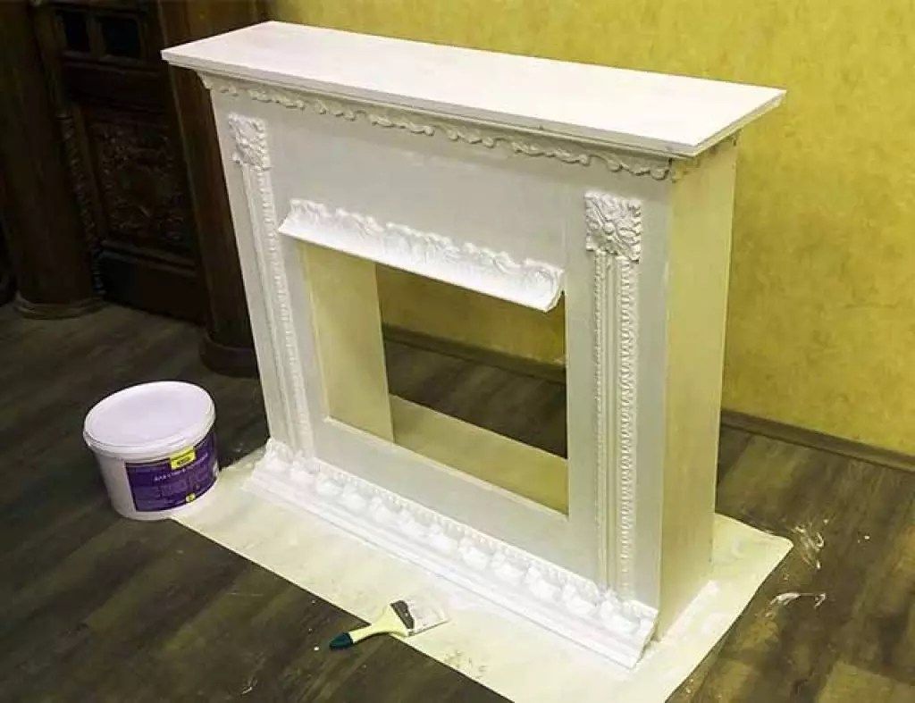 - Камин должен быть подготовлен — выровняйте шпаклевкой все изъяны, неровности, затрите места стыков. Также выкрасьте изделие.