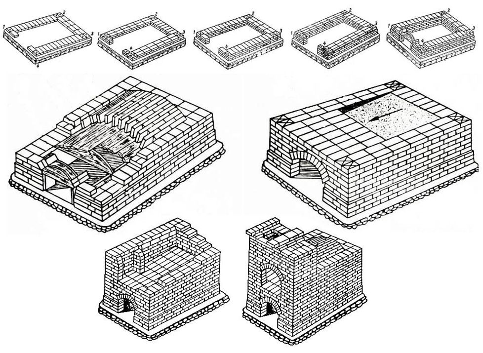 Основание кладки выполняют в косую штриховку из простого красного кирпича, на цементно-песчаный раствор. Эта часть находится под топкой и не будет испытывать высоких тепловых нагрузок. Топочную часть выкладывают из красного керамического кирпича, в сочетании с огнеупорным (шамотным) материалом. В качестве раствора используют глиняную смесь с песком (иногда с добавлением шамота).