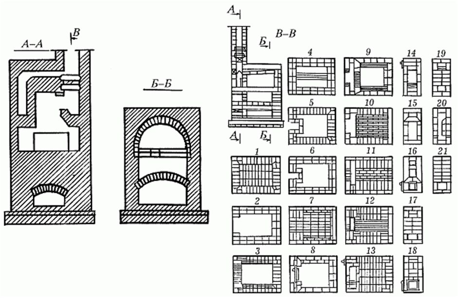 Такие печи носят название колпаковых из-за присутствия в конструкции пустот для сбора горячего дыма. Есть печь с духовкой из кирпича, туда встраивают плитку для готовки, лежанку. Разработаны варианты с одной полостью или строят двухколпаковые печи. Ограниченные полости имеют определенную форму, играют роль разделителей тепла.