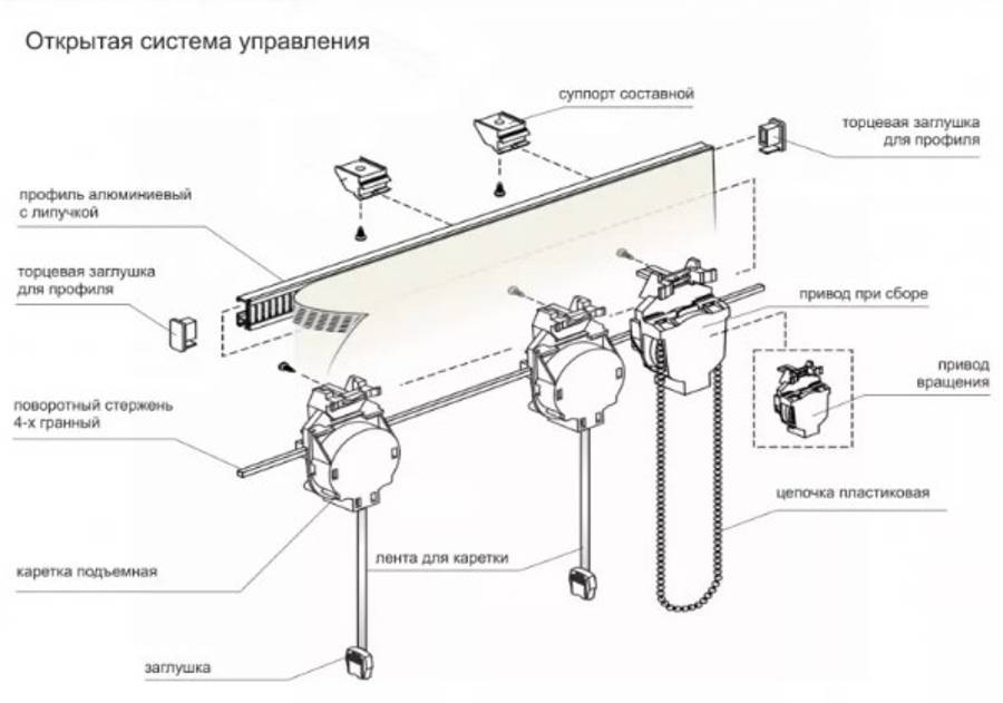 Технология предполагает прикручивание саморезами конструкции непосредственно к потолку или стене. Шторки крепятся в соответствии с пошаговой инструкции: