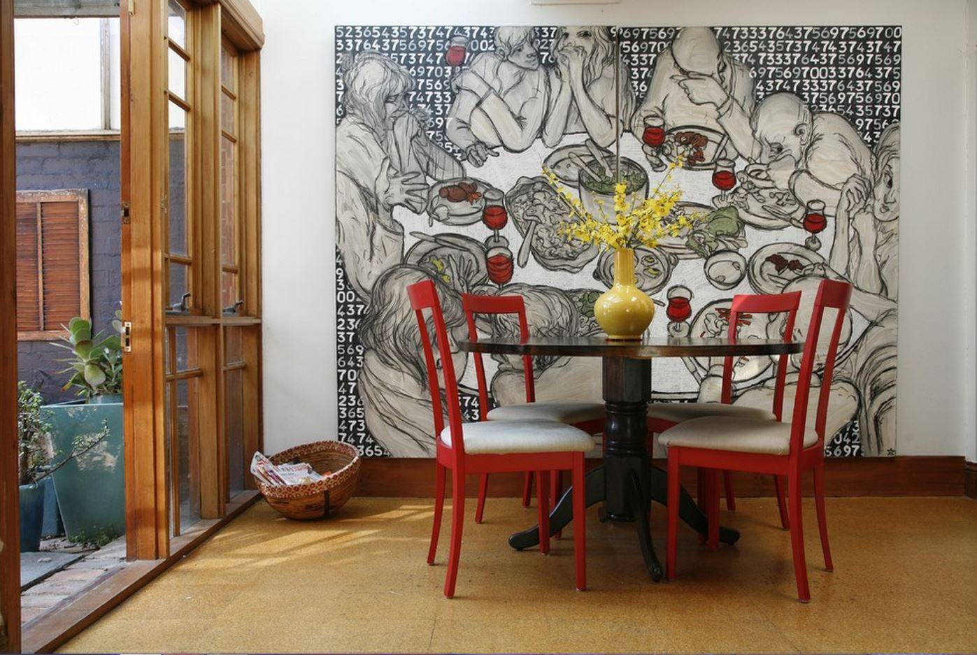 Если подобный контраст кажется вам слишком ярким, то интерьер можно разбавить элементами декора, которые по цветовой тематике будут перекликаться с оттенками картины: например, подушками или стульями.
