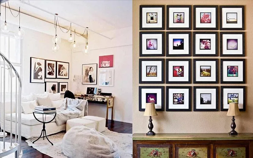 - Составление композиций, как в галерее. Все картины располагаются в одну линию параллельную полу и потолку. Для этой цели стоит использовать изображения одинаковые по форме и размеру.