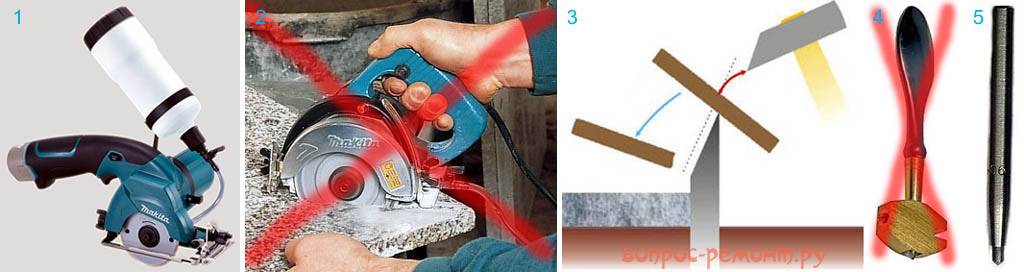 В спецификациях и серьезных руководствах по обработке керамогранита однозначно указывается, что резать его можно только гидроабразивным способом, для чего предназначен особый инструмент, поз. 1 на рис; в бачок заливается специальная эмульсия. Обычная ручная дисковая пила с алмазным кругом керогранит тоже возьмет (поз. 2), но, поскольку он всего на 1 градацию по Моосу слабее алмаза, в воздухе неизбежно окажется алмазная пыль. Респиратор и защитная одежда против нее бессильны, а для здоровья она губительна. Тем более, что ее действие кумулятивное, т.е. постепенно накапливается в организме, а методов лечения соответствующих заболеваний не существует.