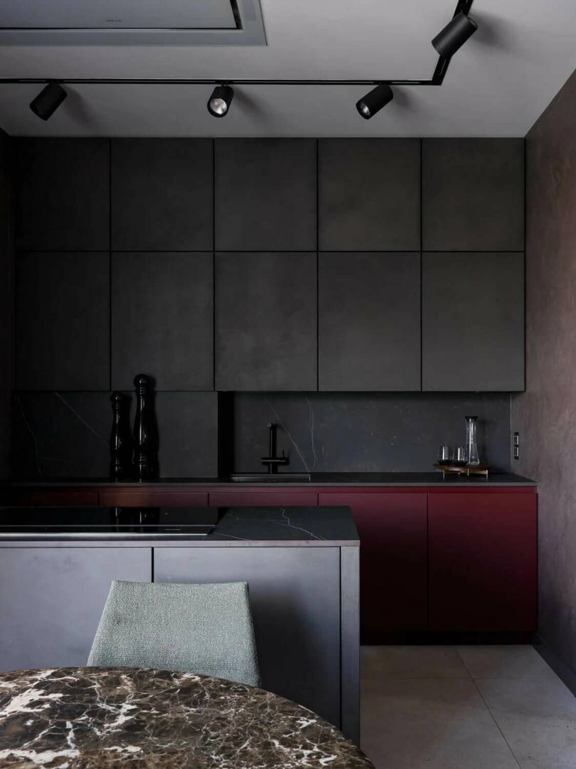 Дуэт двух благородных тёмных оттенков — глухого красного и графитово-серого — в интерьере современной кухни. Проект квартиры в новом доме в центральном районе Петербурга, дизайн — PM Design