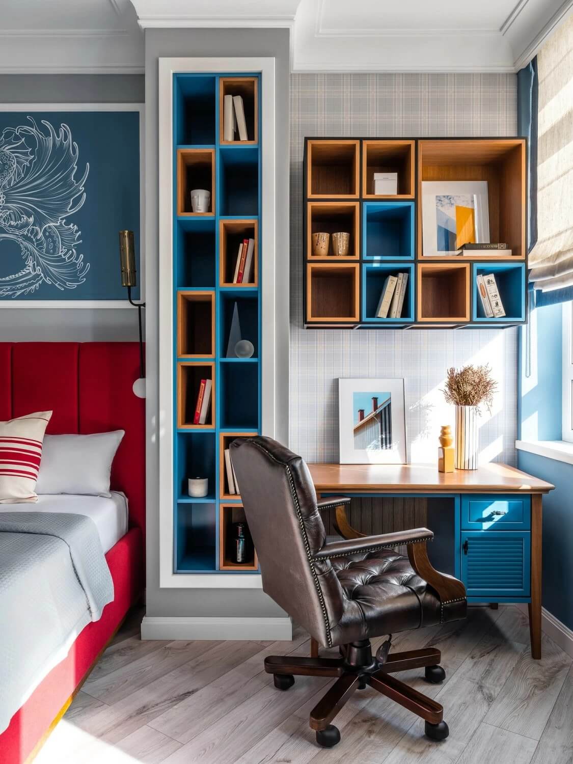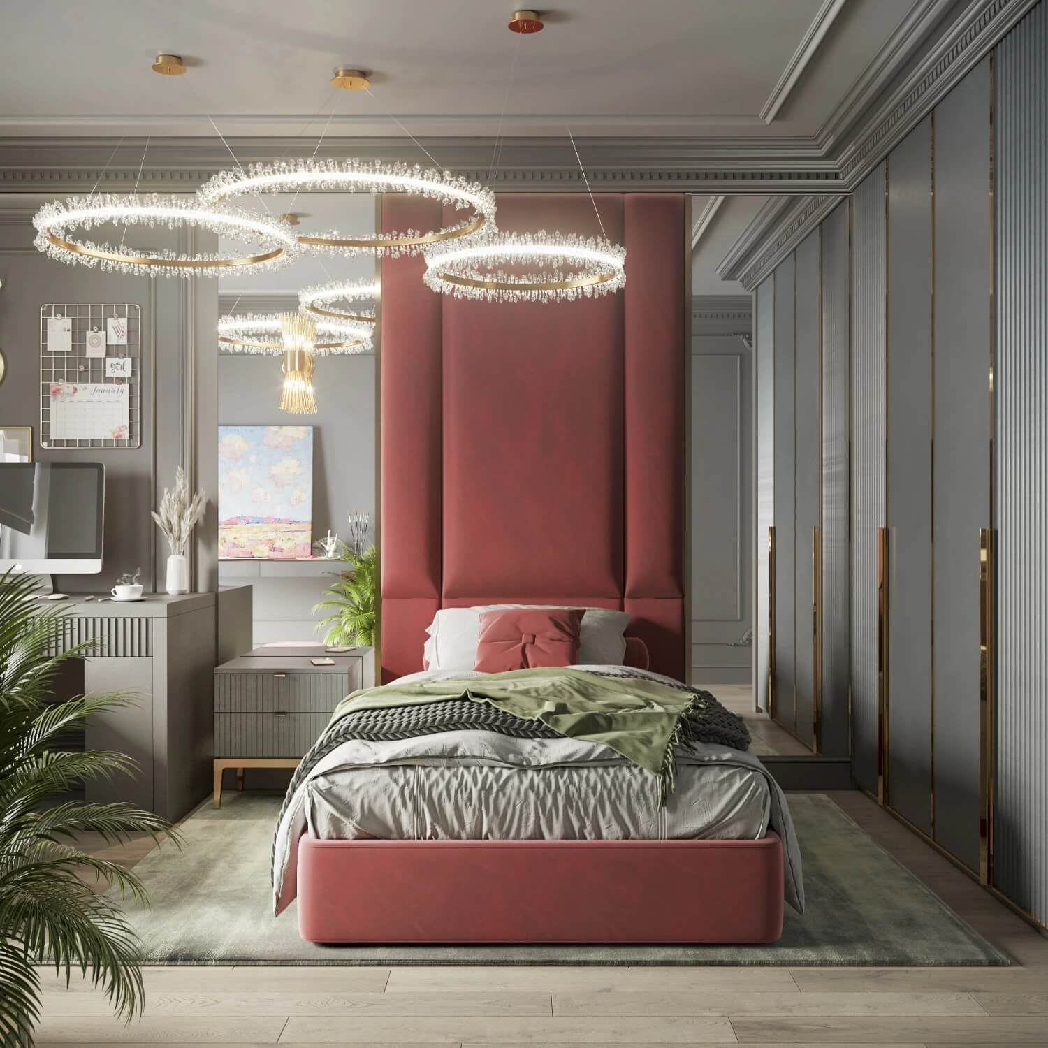 Красная кровать в интерьере современной спальни. Этот цвет создаёт выразительный контраст с общей бежево-голубой гаммой. Причём он не будет утомлять взгляд — когда лежишь на кровати, яркая обивка не видна. Проект квартиры в ЖК «Розмарин», дизайнер Анастасия Ковальчук
