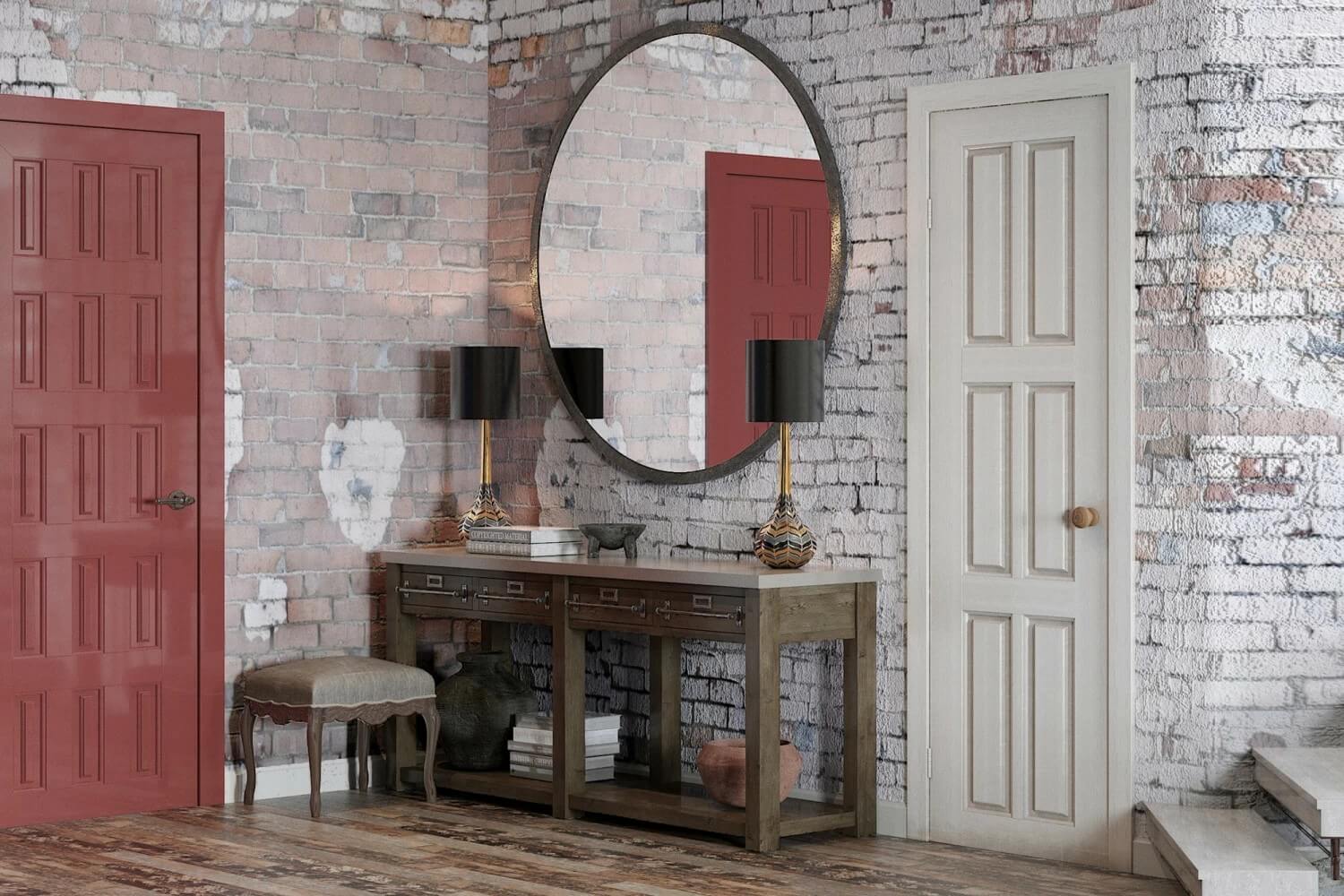 Игра фактур и цветов: дерево и штукатурка под кирпич, белый, коричневый и терракотово-красный — для стен и дверных полотен. Проект дома «Оперетта в дизайне. Сценическая эклектика», дизайнер Анна Новикова