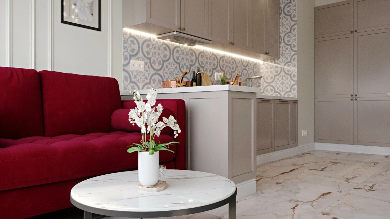 Стены с покрытием под мрамор, сдержанные бежево-серые шторы, белые светильники и вазы и вдруг — взрыв цвета: мягкий диван сочного ягодно-красного цвета. Так выглядит современный интерьер, в котором есть энергия. Проект квартиры в ЖК «Данилов дом», дизайнер Анастасия Ковальчук