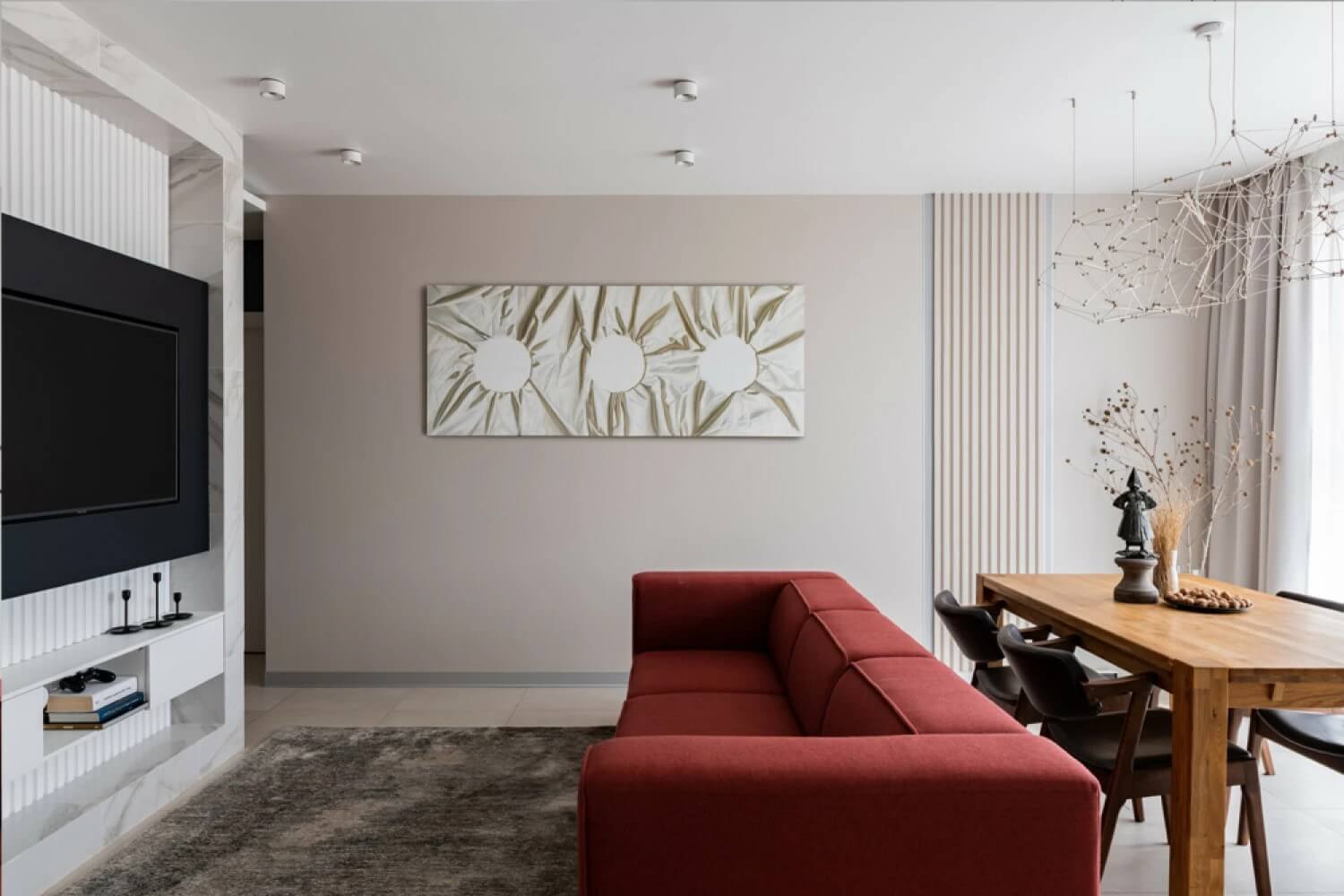 В этом минималистичном интерьере стол из некрашеного дерева и карминно-красный диван — это островок тепла. Природная фактура и природные оттенки помогают сделать обстановку более оптимистичной и дружелюбной. Интерьер квартиры в ЖК «Рождественский», дизайнер Ольга Погорелова