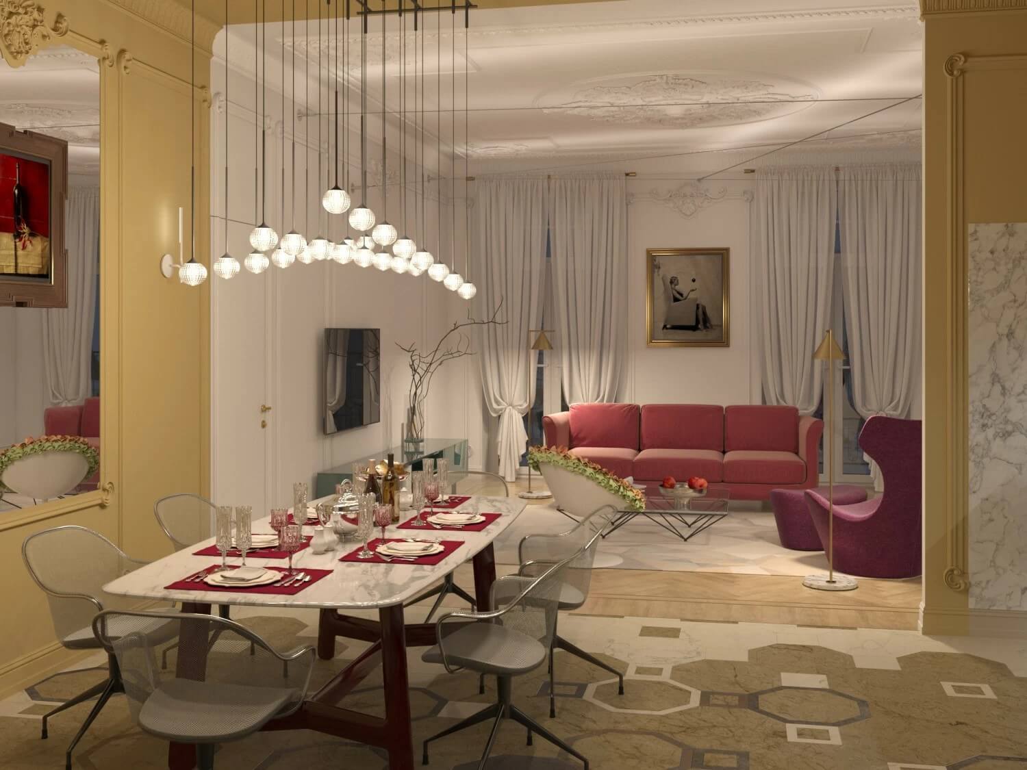 Пурпурные кресла и красный диван в зоне гостиной перекликаются с отдельными цветными элементами в столовой. Также ощущению смысловой цельности интерьера способствует и общий нейтрально-бежевый фон. Интерьер квартиры в клубном доме «Баркли», дизайн — Intelligent Interiors